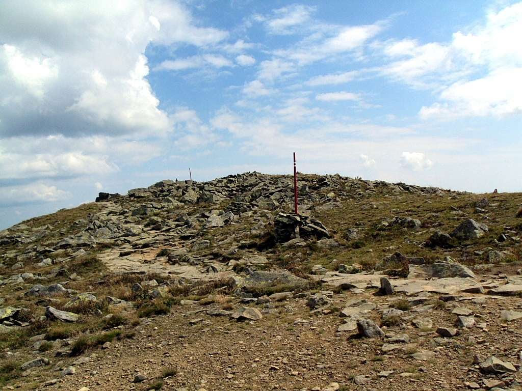 I wreszcie sam Diablak !!... Już z daleka widać charakterystyczny kamienny murek-wiatrochron, a przed nim po prawej stronie szlaku, kamienny obelisk pochodzący z 1876 roku. Został on postawiony w 70-tą rocznicę pobytu na szczycie tej góry - arcyksięcia Ferdynanda Habsburga (późniejszego cesarza Austrii i króla Węgier). Napisy na nim wyryto w języku węgierskim..