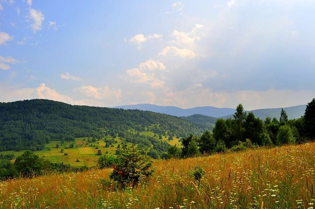 Miejsce to było tak ciche spokojne, pachnące polnymi kwiatami i suszonym sianem, że postanowiłem tutaj na chwilę odpocząć.. Pogoda cały czas była upalna i choć niebo nie było jednostajnie błękitne to jednak żar lał się z góry niczym gorący ukrop.. Usiadłem w cieniu rozłożystego jawora na skraju dużej łąki z widokiem na dwa pasma górskie... Wyjątkowość tego miejsca polegała na tym ze po lewej stronie wspomnianego wzniesienia Wełczonia widoczne było doskonale na horyzoncie, pasmo Policy....