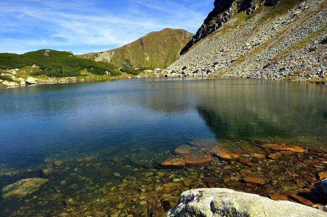Przy jednym z wielkich skalnych bloków, nad samym brzegiem stawu, zakładam bazę odpoczynkową.. Szafirowo-szmaragdowa tafla Wyżniego Rohackiego Stawu, odbijająca w swej toni kolory granatowego nieba i zieleni otaczającej ją kosodrzewiny, wygląda w ten piękny, słoneczny dzień wręcz bajkowo... Dopełnieniem malowniczej panoramy jest przeciwległe, miedziano-oliwkowe wzniesienie Wołowca...