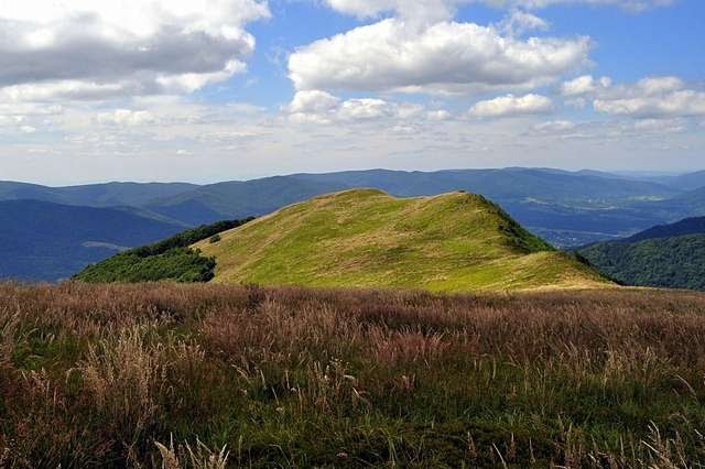 Im wyżej, tym rozleglejsza panorama na odległy o 300 metrów, zielony grzbiet i wierzchołek Roha (1255 m) - najwyższe wzniesienie Połoniny Wetlińskiej..